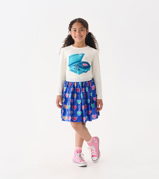 • Long-sleeve pajama set featuring a cream background with colorful heart patterns in pink and red, with contrasting cuffs.