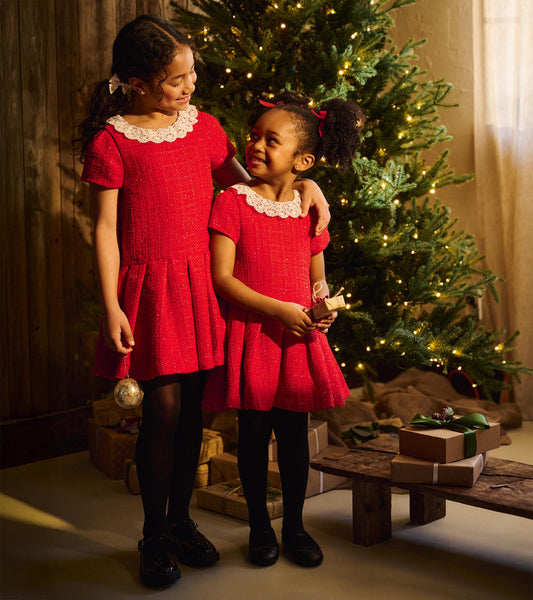 Girls Sparkle Boucle Pleated Lace Collar Dress