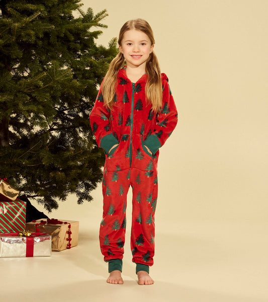 Kids Trees On Red Hooded Fleece Jumpsuit