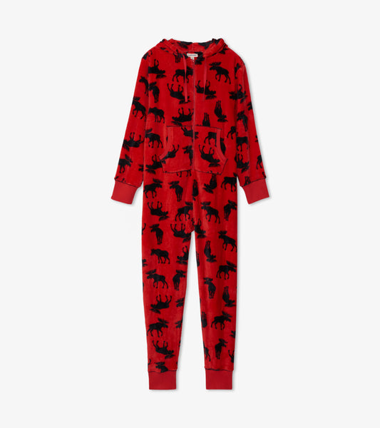 Combinaison de jour à capuchon en molleton pour adulte – Orignaux sur fond rouge
