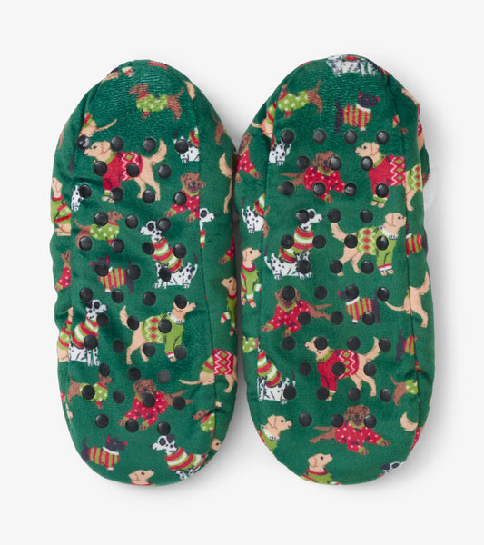 Pantoufles chaudes et douillettes pour femme – Chiens des fêtes sur fond vert