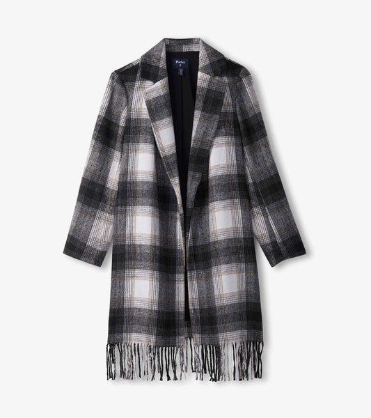 Manteau orné de franges pour femme – Motif écossais noir et taupe