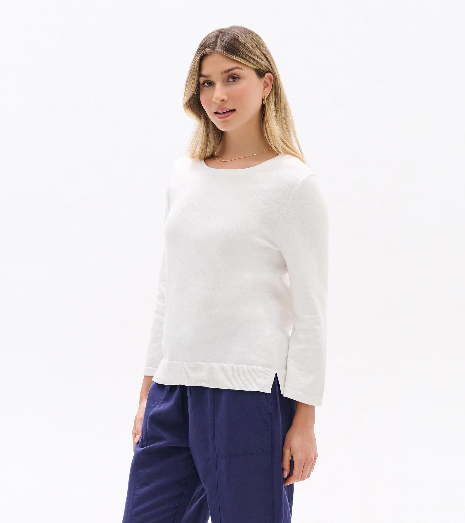 Fresh white brings clean versatility to this cozy sweater knit top with flattering three-quarter length sleeves. The cotton fabric feels soft against your skin while offering the breathability perfect for spring layering. Seamless shaping at the shoulders and armholes creates a polished fit, and the ribbed hem with side vents allows comfortable movement. A wardrobe essential that pairs beautifully with everything from denim to dress pants.