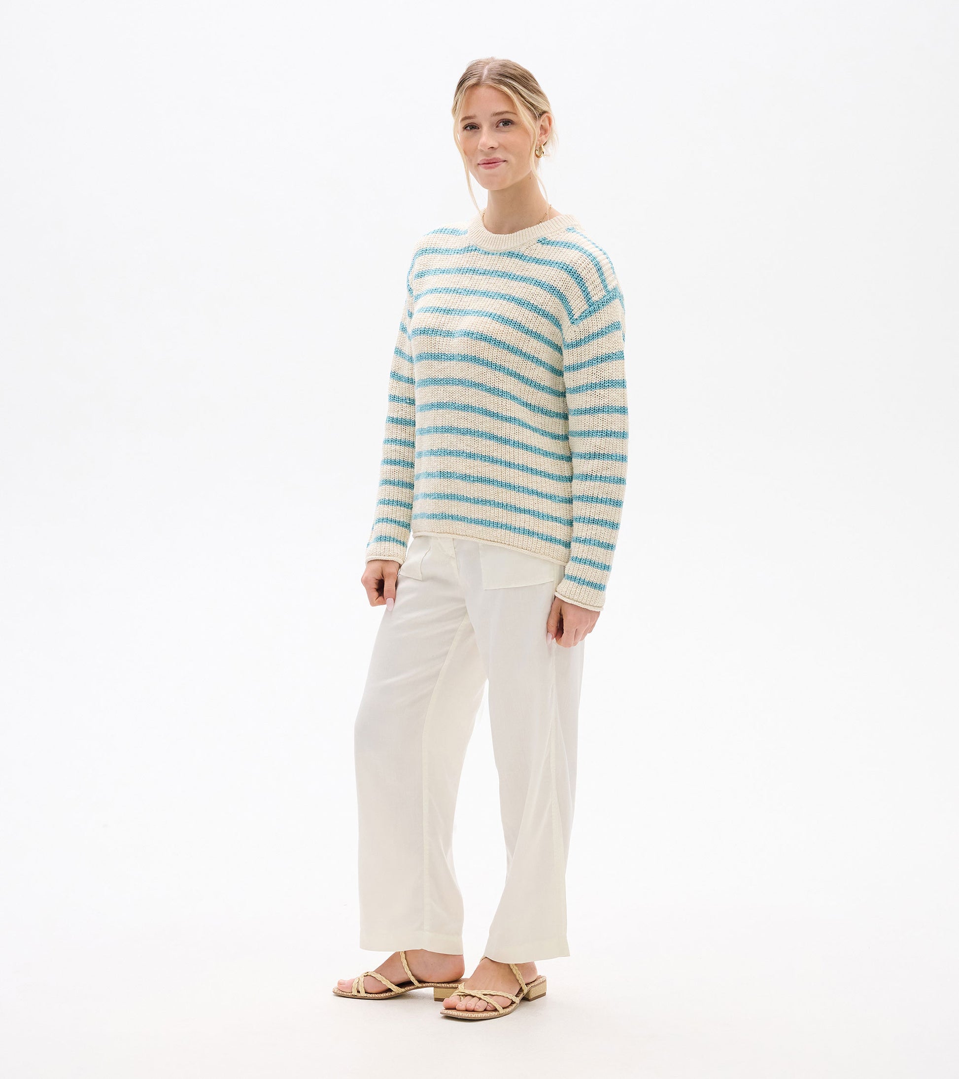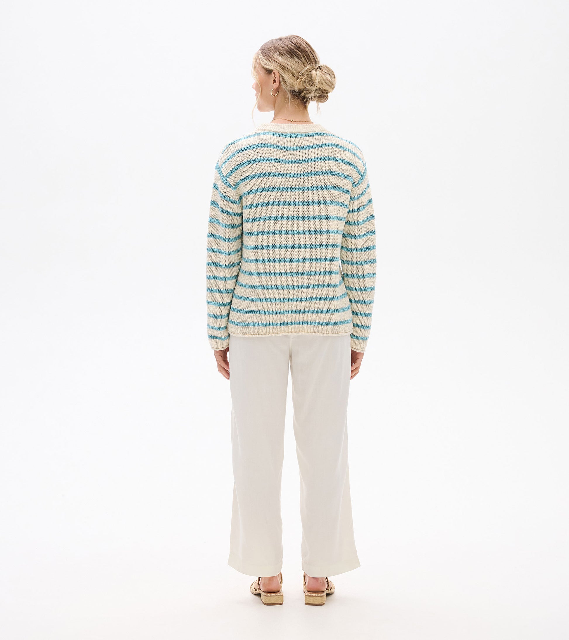 This beautifully crafted cotton sweater brings effortless style to your transitional wardrobe with its relaxed fit and timeless design. The cardigan stitch knit creates subtle texture that adds visual interest, while the rolled hems at the sleeves and bottom give it a lived-in, casual appeal. Perfect for layering over tank dresses in spring or pairing with jeans on cool summer evenings, this versatile piece works from morning coffee runs to evening gatherings. The soft cashmere blue color is fresh and calming, making this an easy choice when you want to look put-together without overthinking your outfit.