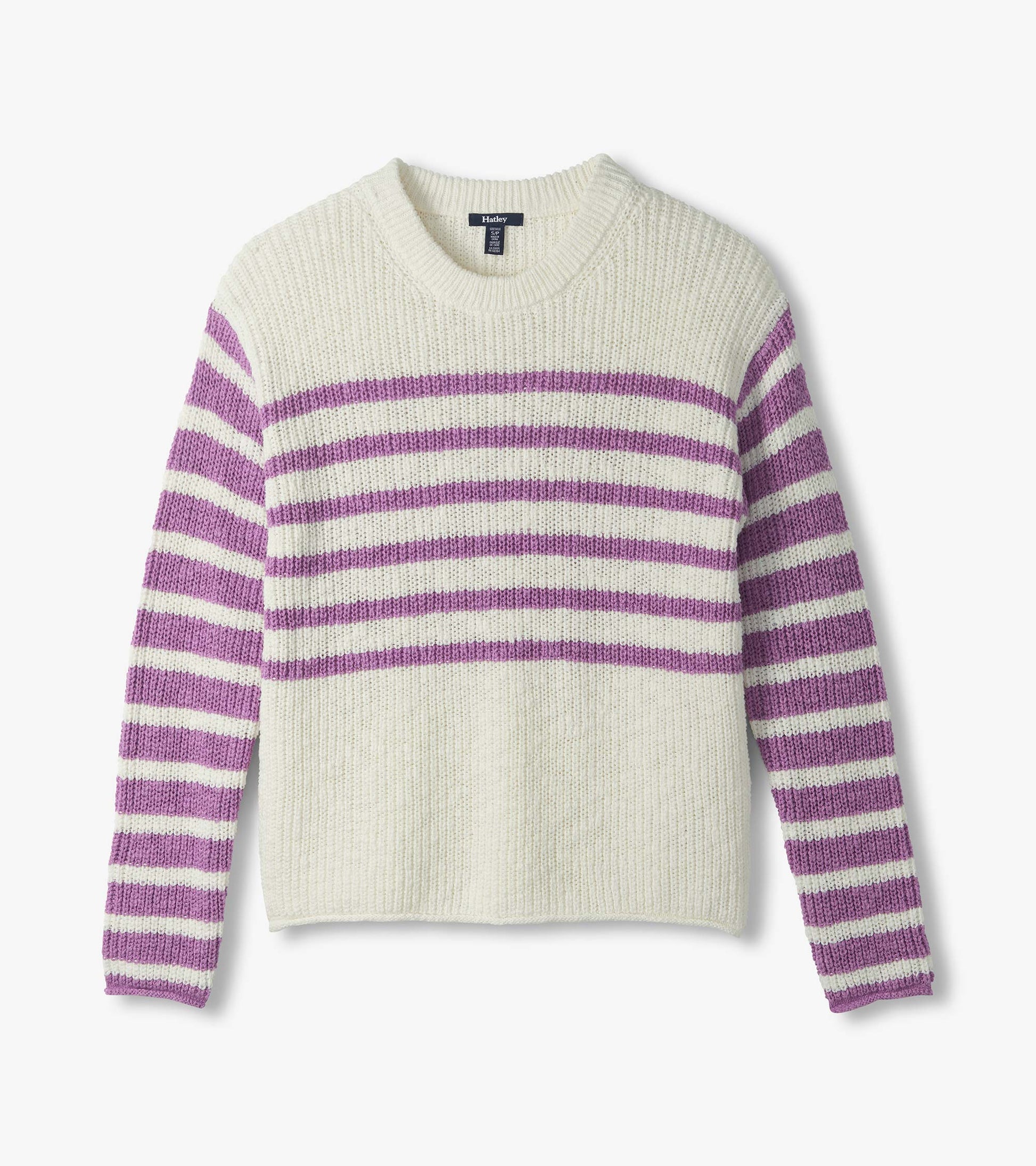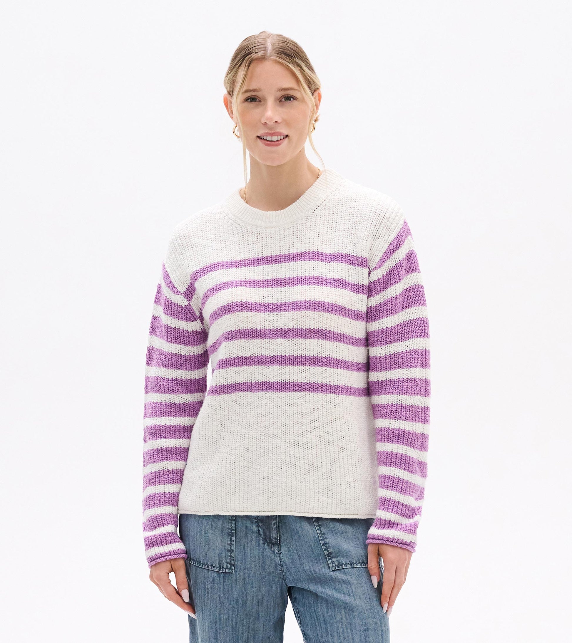 Soft English lavender brings a fresh spring palette to this classic crew neck pullover with beautiful textured knit details. The cotton construction feels lightweight and breathable, perfect for layering without overheating. Relaxed rolled edges at the cuffs and hem create casual elegance, while shaped armholes ensure comfortable movement. A lovely transitional piece that adds color to your cool morning and evening looks.