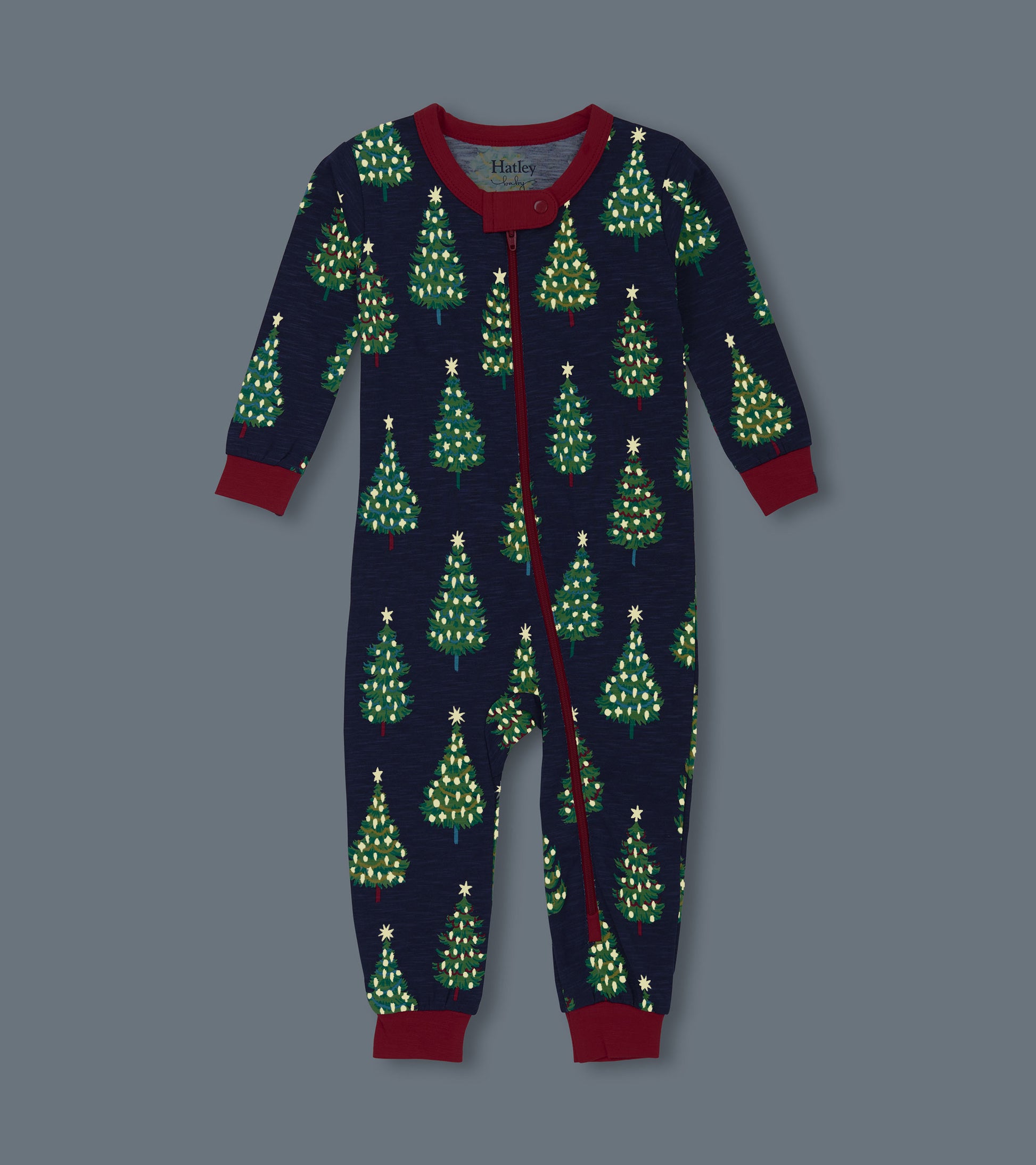 Get your little one ready for cozy holiday nights with the Baby Boys Bottle Brush Trees Cotton Sleeper, crafted from 100% cotton for breathable comfort. This footless, snug-fitting sleeper features a festive print of green Christmas trees adorned with twinkling lights and star toppers, playfully scattered across a heathered deep navy-blue background. Designed with a round neckline, long sleeves, and bright red cuffs at the wrists and ankles, it brings seasonal cheer to bedtime. The full front zipper with an interior guard and snap tab at the neckline makes for easy, gentle changes while keeping your baby snug and secure.