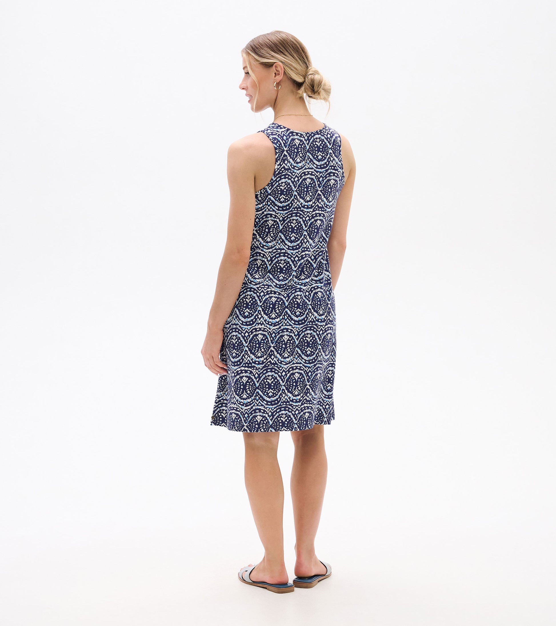 Slip into this sleeveless dress featuring a soft scoop neckline and flared skirt that moves with ease. Crafted from a breathable cotton-modal blend with a hint of spandex, it’s designed for all-day comfort and easy care. The navy blue base is brought to life with an all-over hand-drawn ikat print in white and light blue, giving it a coastal, artisan feel. Lightweight and easy to layer, it’s a natural choice for warmer weather.