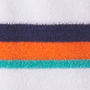 Help them stay warm with our boys aqua stripes terry pullover hoodie! This white V-neck hoodie features orange, black, and green stripes, with an orange silhouette of a shark on the left side of the chest. Perfect for keeping your little one dry and warm when they get out of the water!