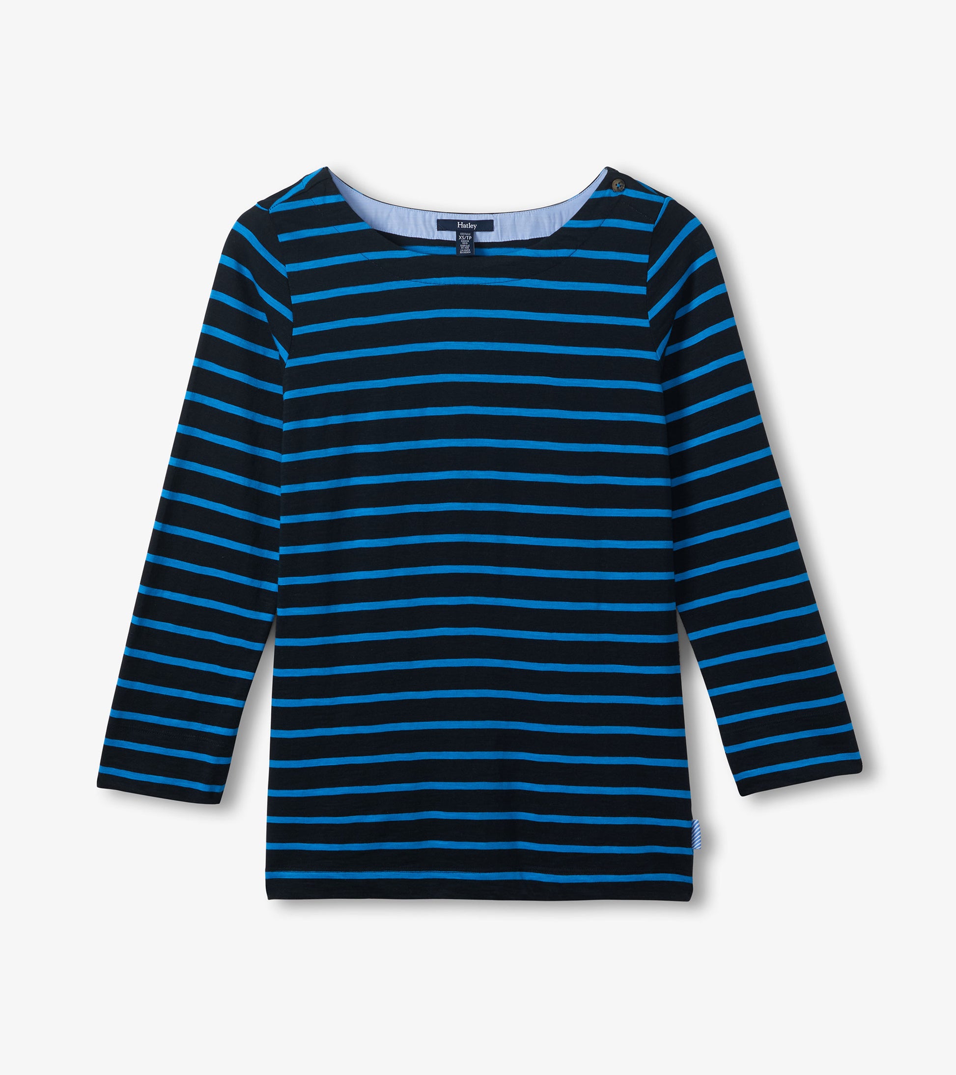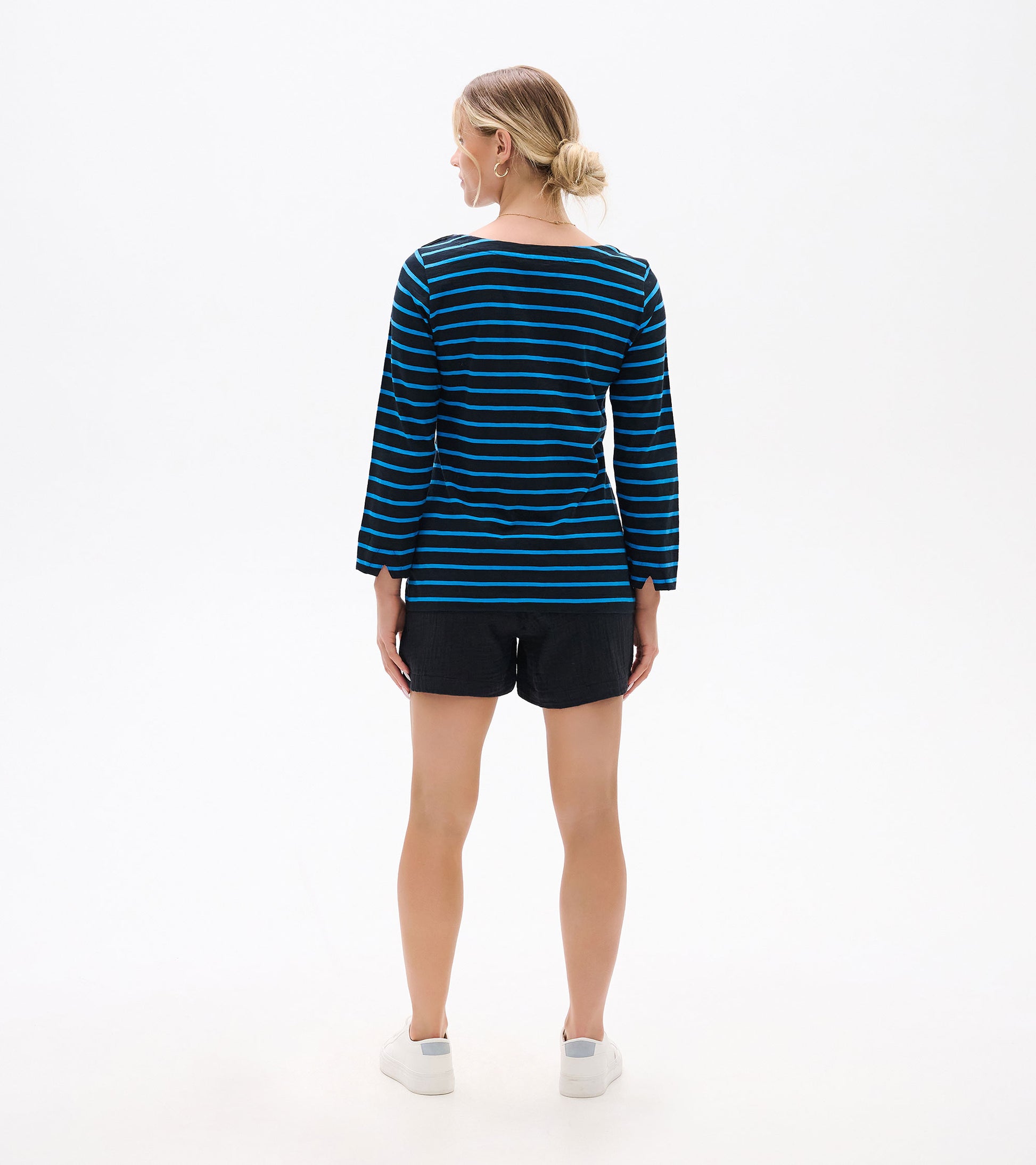 Channel timeless French style with this Breton-inspired top in sophisticated blue stripes that never go out of fashion. The three-quarter sleeves hit at the most flattering point on your arm, while the wide neckline offers feminine elegance. Lightweight cotton knit makes this piece ideal for layering under jackets on breezy mornings or wearing alone when the sun emerges. A polished choice for weekend brunch or exploring farmers markets in style.