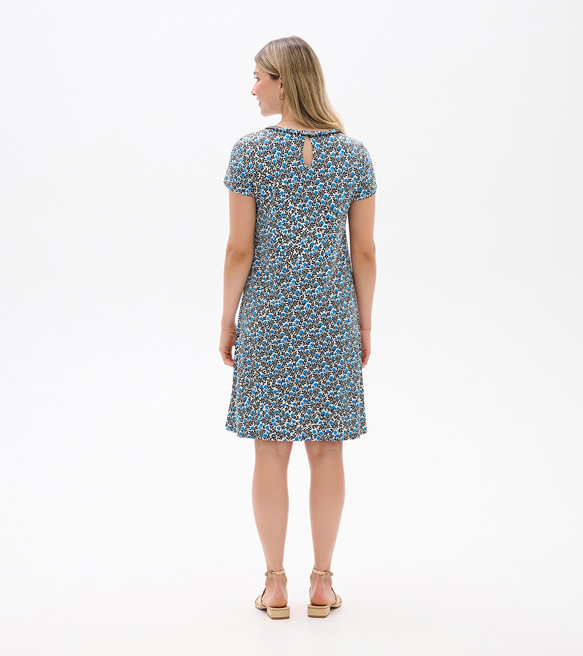 Light and airy with an effortless feel, this A-line dress is crafted from a breathable cotton-modal-spandex blend that drapes without clinging. The above-the-knee length and straight hem create a clean, flattering silhouette, while a keyhole button closure at the back adds a simple finish. The all-over hand-drawn botanical print in black and ivory is brought to life with bright blue floral accents, offering just the right touch of contrast for everyday ease.