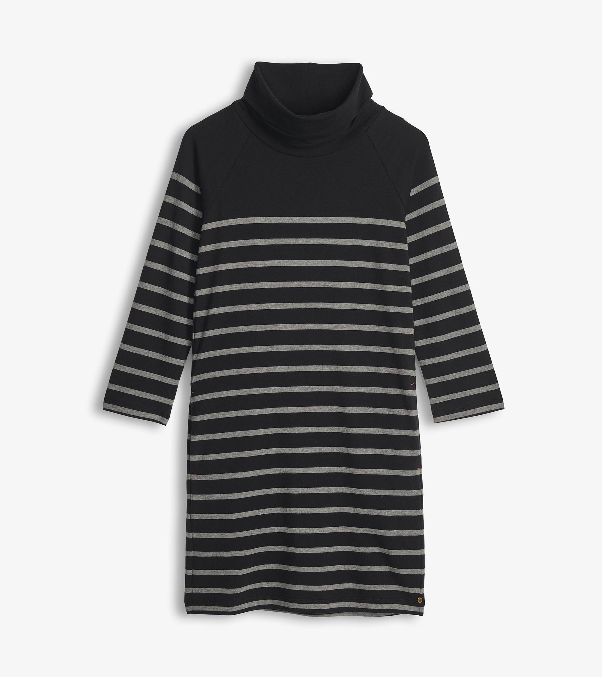 The Draped Collar Dress in caviar stripe is a perfect blend of cotton, modal, and spandex, offering a soft and stretchy fit. The draped collar adds a touch of elegance, while the striped pattern gives it a modern edge. Ideal for both work and casual wear, this dress is as comfortable as it is stylish.