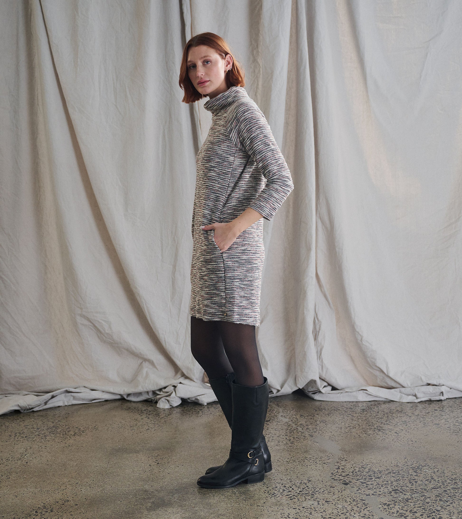 In a classic heather grey, the Draped Collar Dress is made from a blend of polyester and cotton, providing a soft and comfortable fit. The draped collar adds a sophisticated touch, making this dress a versatile piece for both work and casual wear.