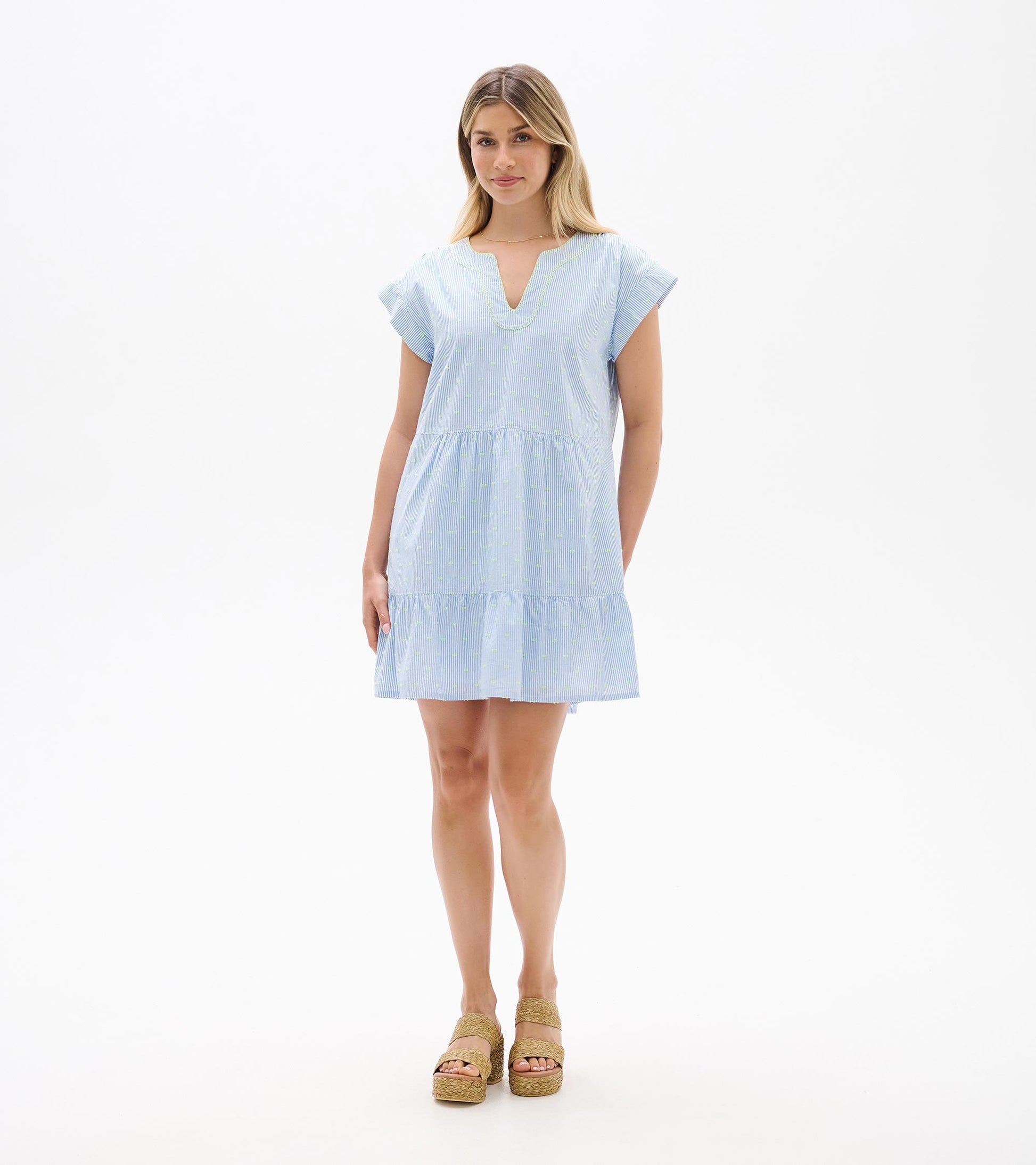 Make a playful statement in this fun midi dress that brings cheerful energy to your warm-weather wardrobe. The whimsical neon dots on stripes pattern adds personality and pop, while the relaxed fit and gathered waist ensure comfortable all-day wear. The tiered ruffle hem creates beautiful movement and adds feminine charm that's perfect for casual summer occasions. Practical side pockets keep your phone and keys close, making this ideal for everything from weekend barbecues to outdoor concerts. The lightweight cotton blend keeps you cool even on the hottest days, proving that fun and functional can definitely go hand in hand.