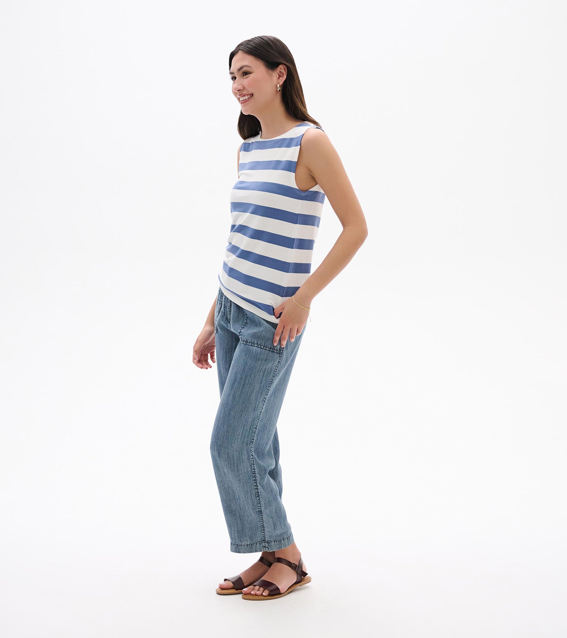 This versatile striped tank in captivating star sapphire tones becomes your go-to foundation for spring layering and solo wear. The viscose and spandex blend moves with you while maintaining its shape beautifully throughout the day. Forward shoulder seams create a flattering fit that works for all body types, and the smooth round neckline pairs seamlessly under cardigans and jackets. Machine washable and endlessly wearable, it's the hardworking essential your closet needs.