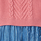 Brighten up her wardrobe with the Girls Flamingo Pink Mix Media Dress, a playful piece designed to look like a two-piece set but crafted as a cozy one-piece for effortless style. The upper portion features a textured, flamingo pink knit with classic cable detailing at the center front and sleeves, made from a soft cotton-viscose blend. A round, ribbed neckline is accented with charming light blue decorative blanket stitching for a handmade touch. The skirt brings a bold contrast with its metallic blue pleated tricot, adding shimmer and comfort.