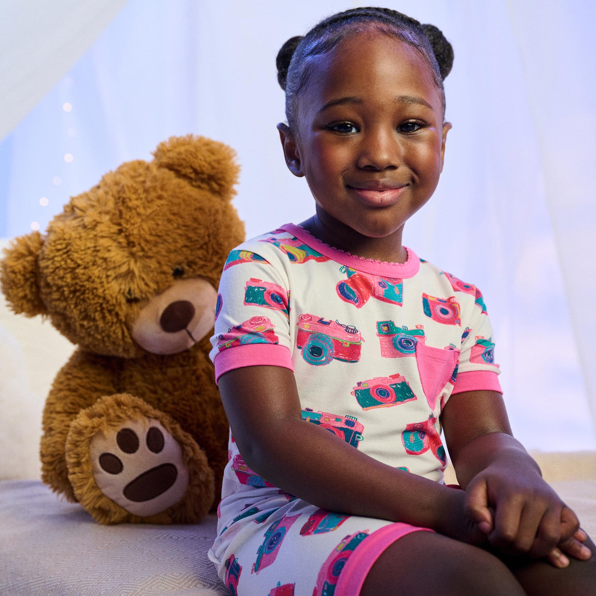 Capture sweet dreams in this playful camera print short pajama set made from silky bamboo viscose. The breathable fabric keeps her cool during warm summer nights while feeling incredibly soft. Seamless sides prevent any irritating rubbing against delicate skin. The snug-fit design meets sleepwear safety requirements while a cute chest pocket adds personality. Perfect warm-weather sleepwear for creative girls who love photography.