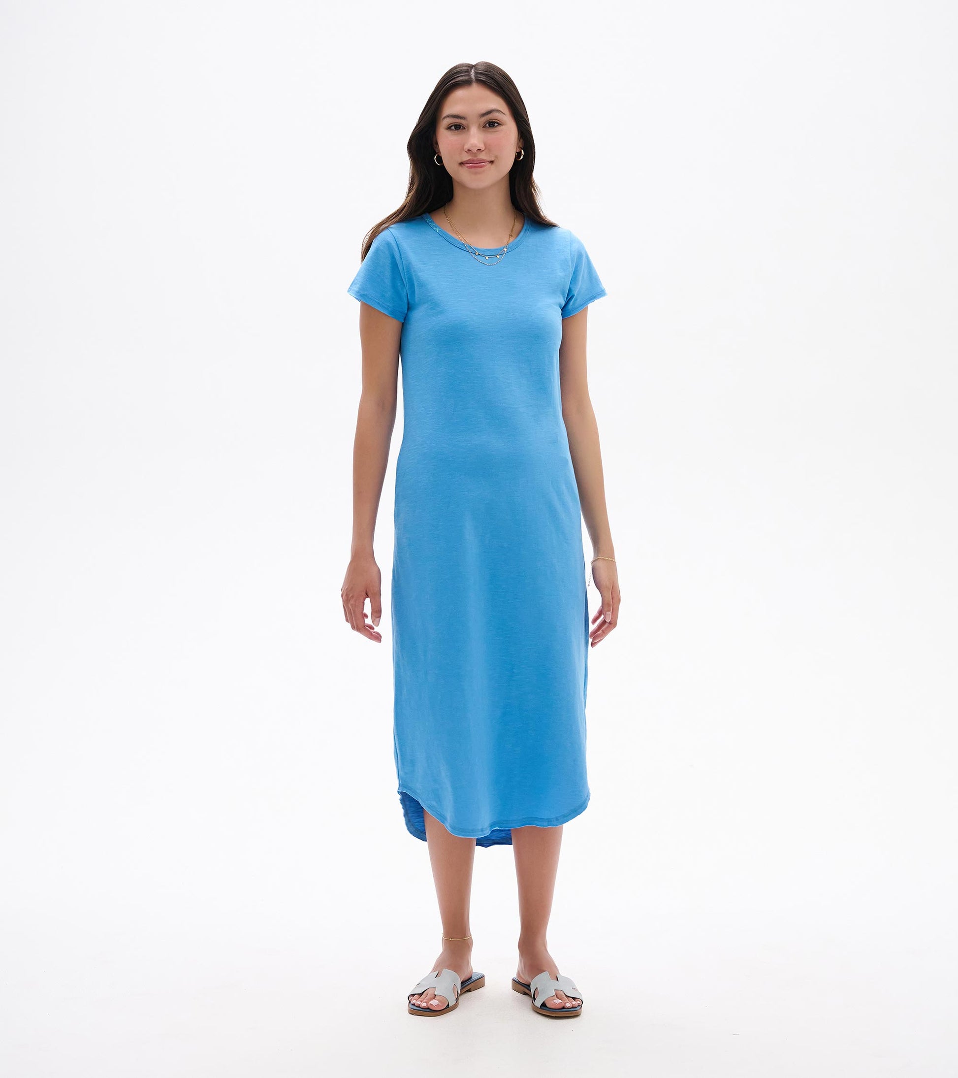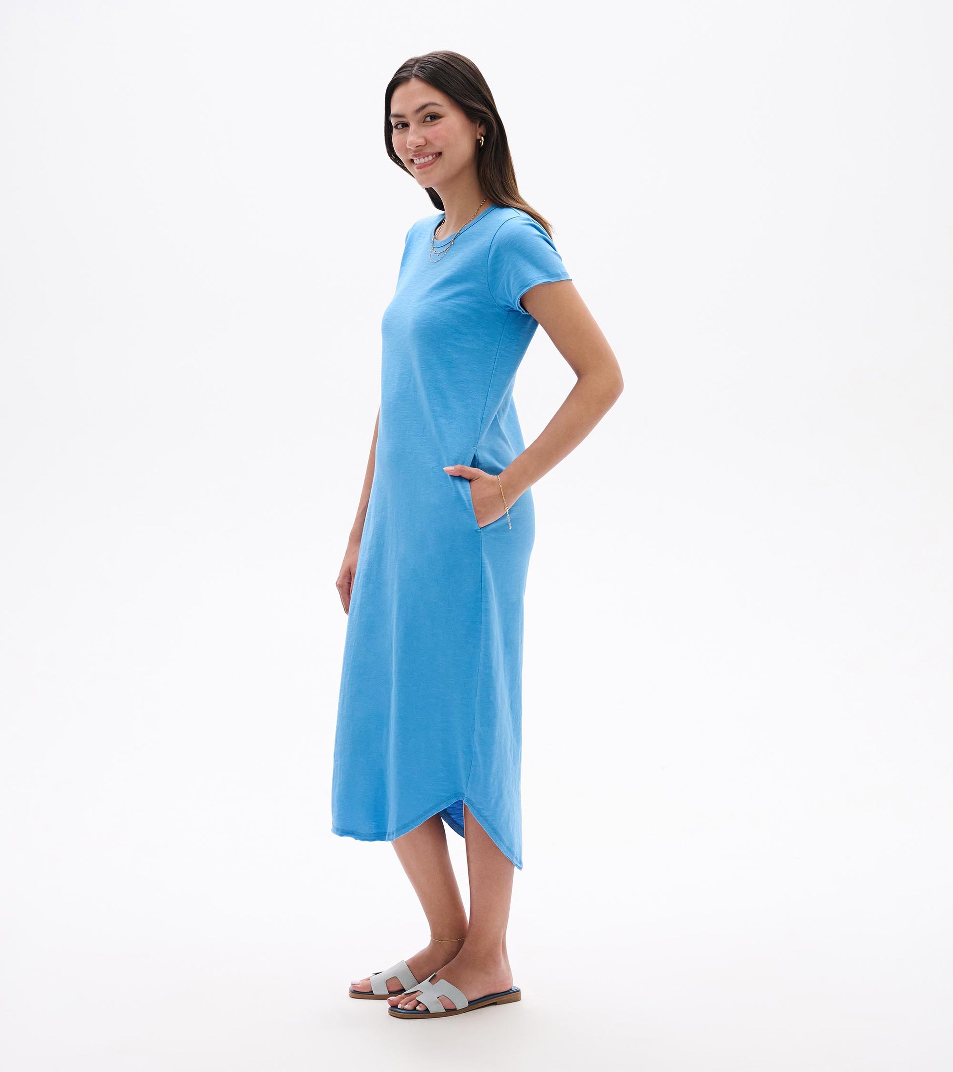 Light, breathable, and easy to wear, this midi T-shirt dress is crafted from soft cotton in a heathered light blue for a laid-back, airy feel. Designed with a relaxed silhouette and a flattering high-low hemline, it features short sleeves with raw edge details that add a casual finish. Decorative contrast stitching at the neckline in soft aqua adds a subtle touch of interest, while discreet side pockets keep it functional. An effortless throw-on piece made for comfort and movement.