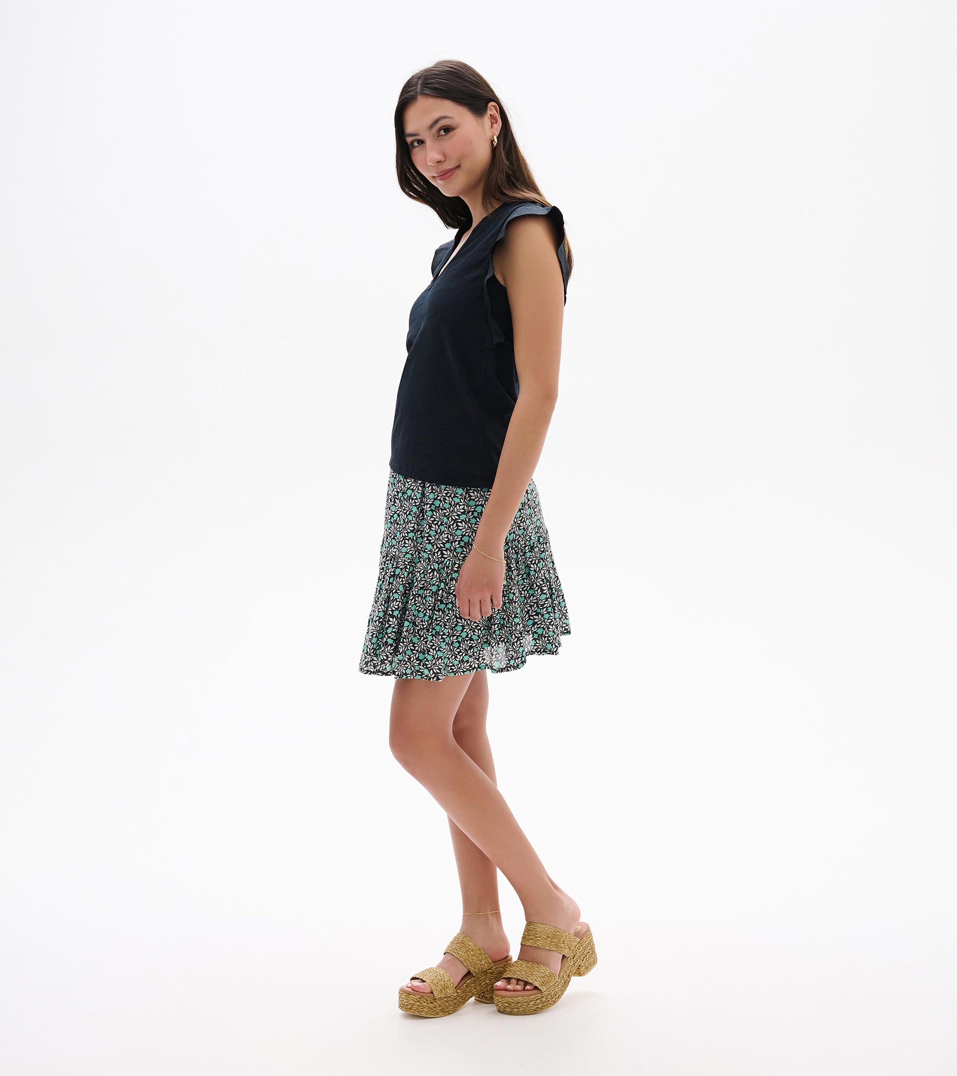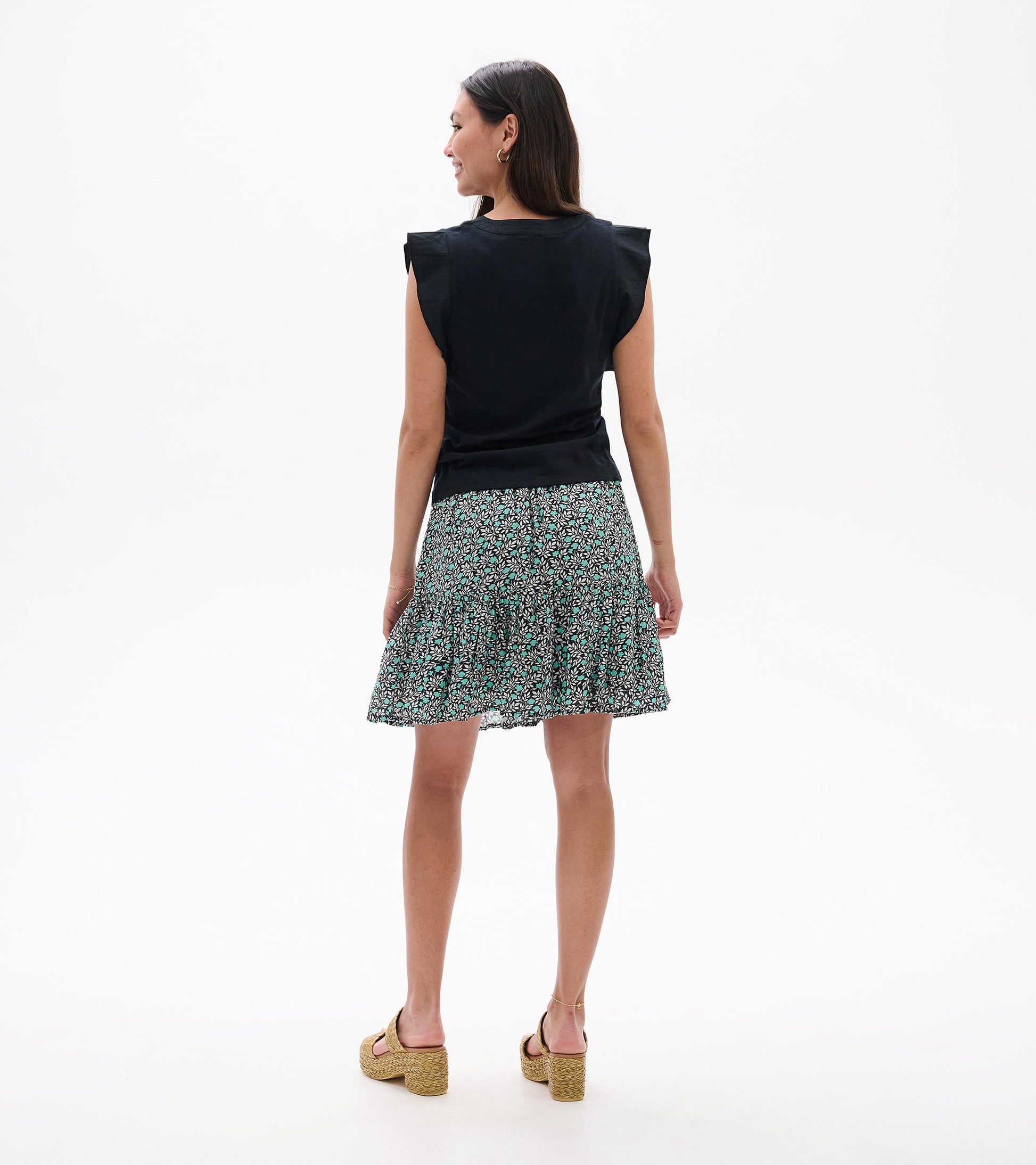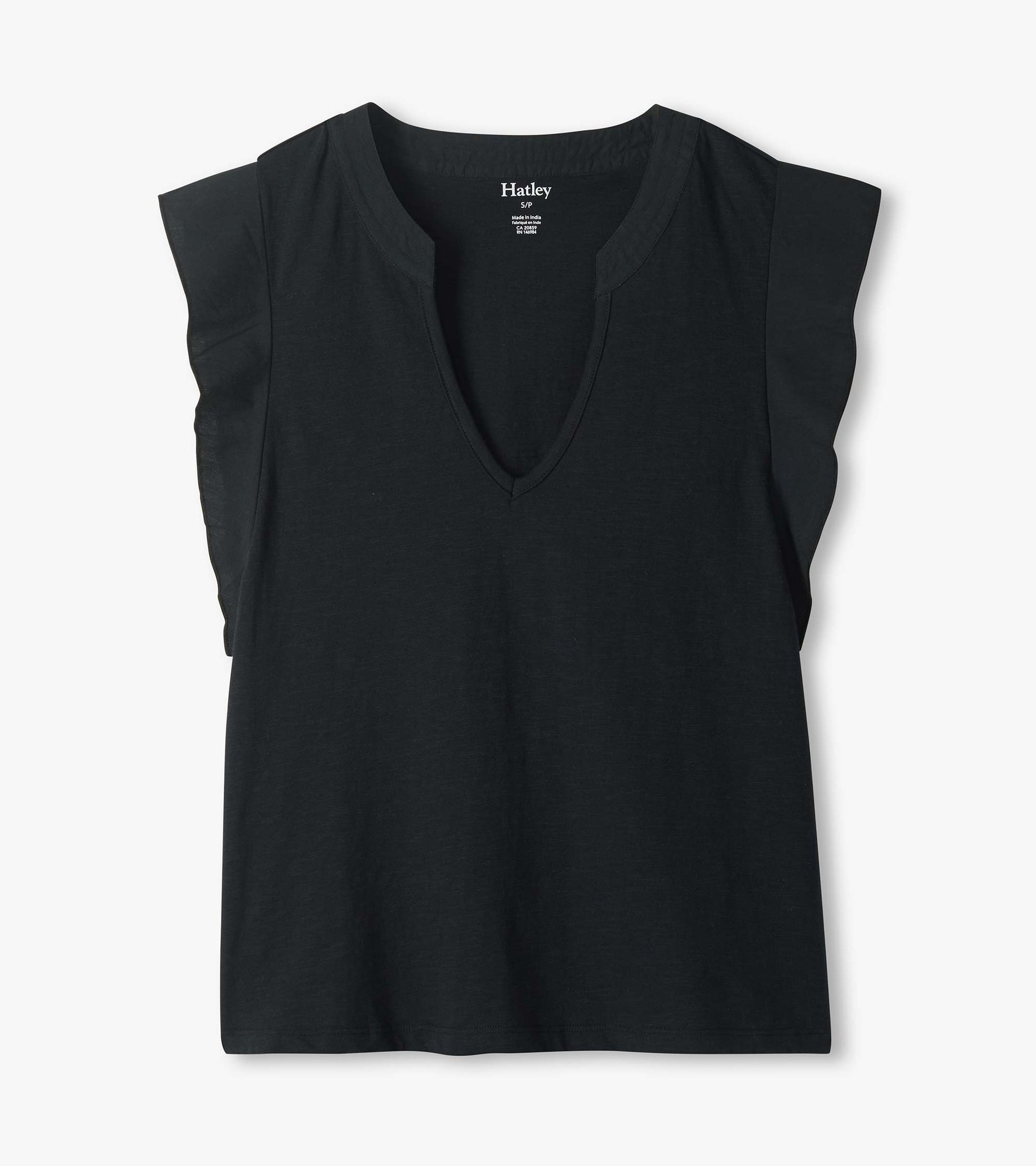 This lightweight V-neck tank is crafted from breathable cotton in classic black, making it a go-to transitional essential. The neckline features a subtle notch at the center front for a refined detail, while flutter-style cap sleeves add soft, airy movement. With a relaxed fit and easy feel, it’s perfect for layering or wearing on its own through changing seasons.